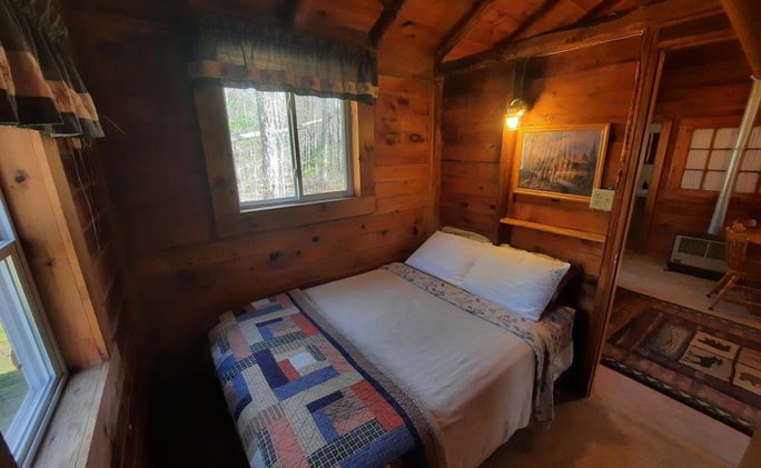 Vacation comfortably in our darling two bedroom log cabin with wood interior and vaulted ceiling- furnished with two double beds, living room twin hideaway bed, one bath, living area and fully equipped kitchen. The Bear’s Den Cabin offers exceptional wooded views and a screen porch with dining table, lounge chairs and a gliding bench so you can relax and enjoy listening to the sounds of nature.